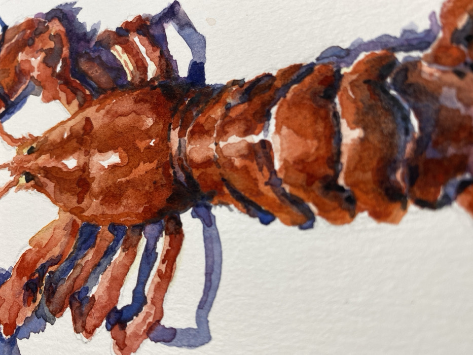 A watercolor painting showcases a lobster in shades of red, brown, and blue