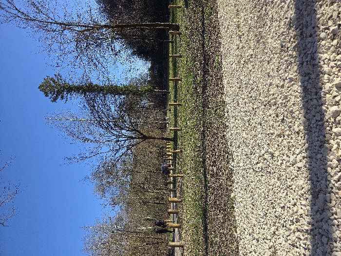 The image captures an outdoor scene within Kaylaka Park, Pleven, Bulgaria, under a clear blue sky on a sunny day. The foreground consists of a broad, light-colored gravel surface with distinct shadows cast across it. Immediately beyond the gravel, a strip of brown fallen leaves transitions into a strip of sparse green grass. A line of approximately 15 light brown wooden bollards extends horizontally across the midground, demarcating an area. In the left background, two individuals wearing dark clothing are walking away from the viewer on what appears to be a paved path. A dark-colored sedan is partially visible in the center-left background, obscured by the bollards and surrounding trees. The background is dominated by numerous deciduous trees, most of which are bare-branched, indicating late autumn or winter. A prominent, exceptionally tall and slender green conifer tree stands vertically in the center-right background, contrasting with the bare deciduous trees. Denser woodland is visible further in the distance.