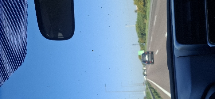 The image captures a forward-facing perspective from inside a vehicle on a multi-lane highway in the city of Bni Yakhlef, Morocco. The windshield, visible in the upper two-thirds of the frame, exhibits multiple specks of dirt or dust and a prominent dark spot or insect in the upper-middle section. A fritted band, composed of a dark hexagonal pattern, is present along the top edge of the windshield. A black rear-view mirror is partially visible in the upper right corner. The lower portion of the image displays a dark automobile dashboard. The external environment features a clear, cloudless blue sky. On the highway, a dark-colored SUV or minivan is visible in the distance, followed by other indistinct vehicles. White lane markings delineate the road. A metal crash barrier lines the left side of the highway, accompanied by streetlights extending into the distance. Green foliage, likely trees and bushes, borders both sides of the road further down the highway, and a partial green road sign is visible on the right. No human figures are discernible.