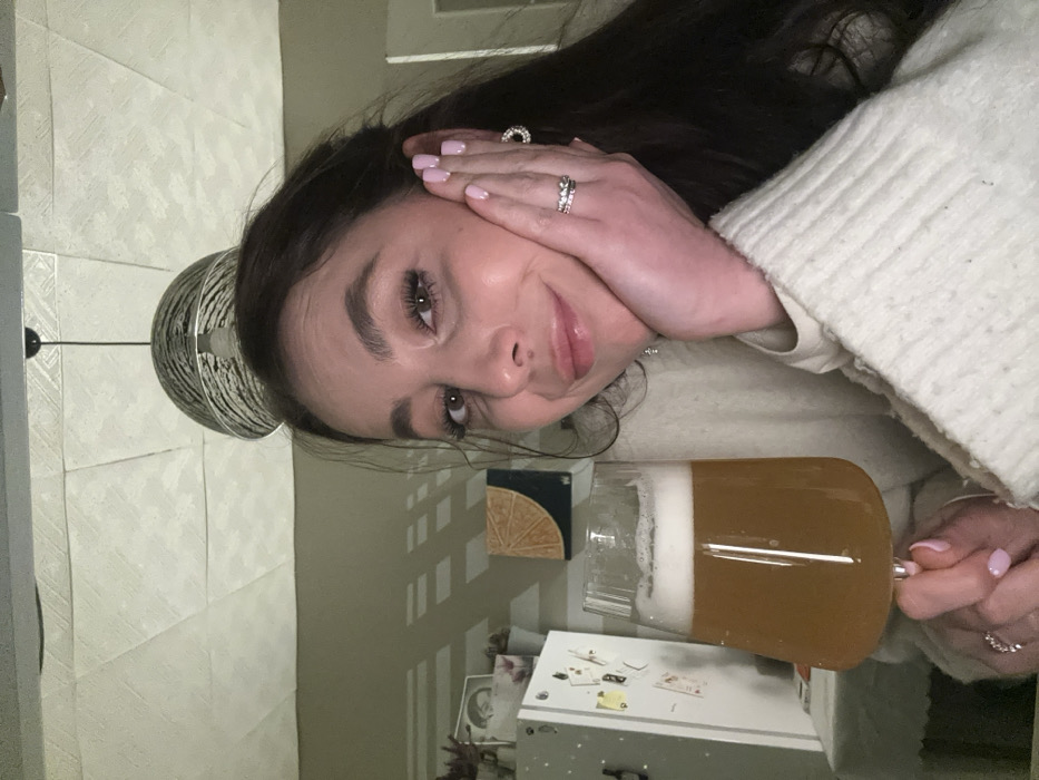 The image displays a single adult female subject indoors, identified as being in Liepaja, Latvia. The subject, with dark hair, is presented in a close-up, slightly angled frontal view, looking directly at the camera with a subtle smile. Her left hand, featuring pink nail polish and rings on the ring finger, is positioned against her left cheek. Her right hand, also with pink nail polish and a ring, holds a clear stemmed glass filled with a light amber liquid topped by a white foamy head, consistent with beer. She is dressed in a light-colored, possibly off-white, chunky knit sweater. The background includes a partial view of a white refrigerator with attached items on the left, and a small rectangular artwork with a geometric orange and dark blue pattern mounted on the wall. Above, a light-colored, textured paneled ceiling is visible, from which a spherical light fixture with a decorative shade is suspended.