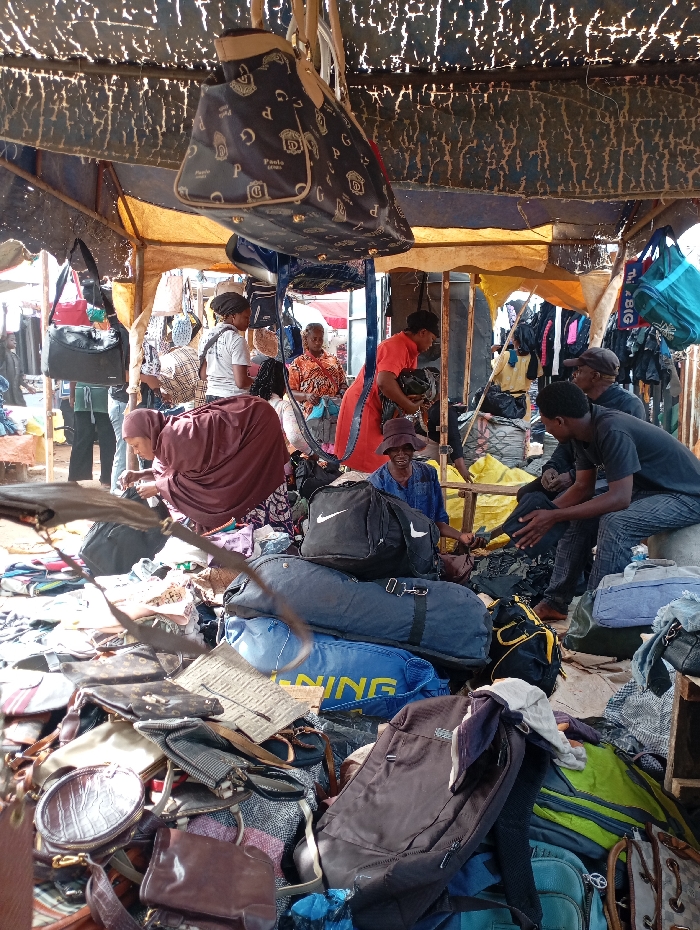 The image displays a bustling market stall in Nyanya, Nigeria, operating under a dark, weathered fabric canopy that filters natural light. The primary merchandise consists of numerous bags of various types and conditions, piled on the ground and suspended from the stall's framework. A dark blue handbag with "Paolo G" branding hangs prominently from the canopy. On the ground, a black Nike duffle bag, a dark blue duffle bag, and a light blue duffle bag with "NING" (likely "TRAINING") text are visible among a multitude of other handbags, backpacks, and luggage, some bearing patterns resembling luxury brands such as Fendi and Louis Vuitton. At least ten individuals populate the scene, engaged in commercial activity. In the foreground, a person clad in a maroon garment is bent over examining items. To their right, two men are seated on a low structure; one in a black t-shirt actively inspects merchandise, while the other, wearing a grey cap, observes. A person in a brown hat is seated further back. In the mid-ground, a woman in a vibrant orange patterned dress holds a dark item, while another woman in an orange patterned top stands nearby. To the left, a woman in a white t-shirt is visible. The individuals appear to be browsing, selling, or arranging goods within the densely packed market environment.
