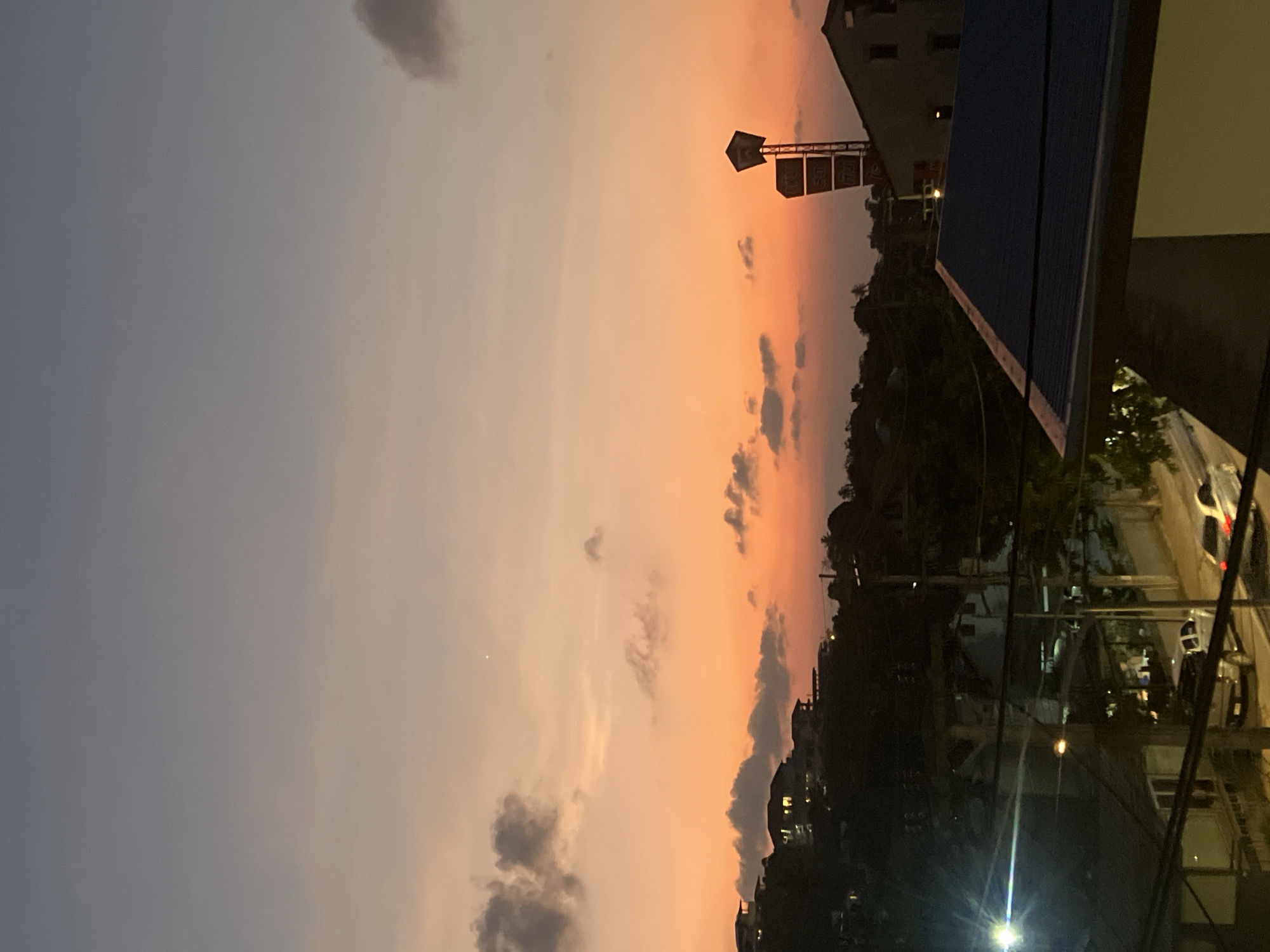 The image depicts an evening scene in Baan Plai Laem, Thailand. The sky transitions from a greyish-blue to a vibrant orange near the horizon, punctuated by scattered grey clouds. Silhouetted against this colorful backdrop are buildings, trees, and utility poles. A prominent structure with a square roof and communication tower stands near the center of the frame. The lower portion of the image shows a street with parked cars and buildings illuminated by streetlights. Some lights on the vehicles. There's evidence of habitation with lights on in various buildings. The overall atmosphere suggests dusk settling over a residential area.