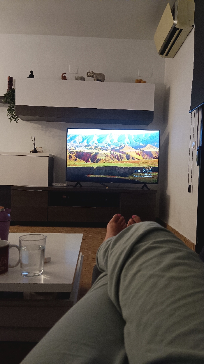 This image depicts a residential living room in Sagunto, Spain, observed from a low-angle, first-person perspective. The foreground features the lower legs and bare feet of an individual, clad in light-colored trousers, with toenails painted a reddish-pink. The feet are elevated, resting in a comfortable position. To the left, a white coffee table holds a clear glass of water and the upper portion of a purple mug. The central focus is a large, black-framed flat-screen television displaying a vibrant outdoor landscape image of arid, multi-colored mountains under a bright sky. Overlaid on the screen are digital indicators: '16°' (temperature), '8:04' (time), and text explicitly stating 'Sagunto' and 'Nubes claras' (clear clouds), confirming the city and weather. The television is situated on a dark brown media console with multiple storage compartments. Above the television, a white floating shelf is mounted on a white wall, decorated with a small, dark figurine (possibly a seated Buddha), a reddish-brown abstract sculpture, and two grey animal figurines, including an elephant. To the left of the console, a white and grey cabinet holds a dark-colored reed diffuser. A green potted plant with trailing vines is positioned to the left of the floating shelf. An off-white, split-system air conditioning unit is mounted high on the white wall in the upper right quadrant. A dark roller blind and two slender, dark pendant decorations hang vertically on the right wall. The room's walls are white, and the floor is a light brown, possibly wood or laminate. The lighting suggests an evening or low-light indoor environment, with the television screen acting as a prominent light source.