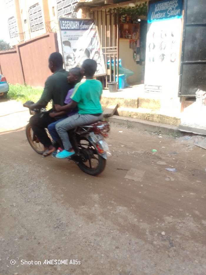 In Egbagu, Nigeria, a daytime street scene depicts three individuals riding a dark-colored motorcycle on an unpaved dirt and gravel road