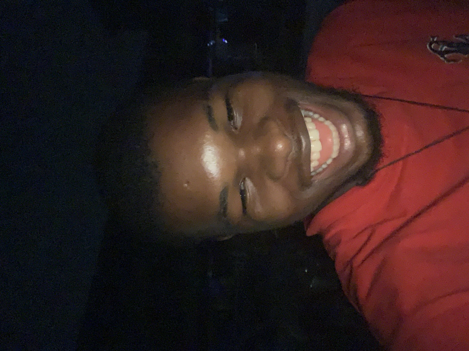 The image displays a close-up portrait of a young adult male, reportedly located in Onitsha, Nigeria. The subject, exhibiting dark skin and short dark hair, is captured with a wide, open-mouthed expression consistent with laughter or a broad smile, revealing both upper and lower white teeth. His eyes are squinted. A small epidermal blemish is visible on his forehead. He wears a red garment, which appears to be a hoodie or t-shirt, featuring a dark emblem on the right side of his chest and a thin, dark cord around his neck area. Illumination is direct and frontal, creating highlights on the forehead, nose, and teeth. The background is uniformly dark and undifferentiated, providing no discernible environmental context. No other individuals or significant objects are present within the frame.