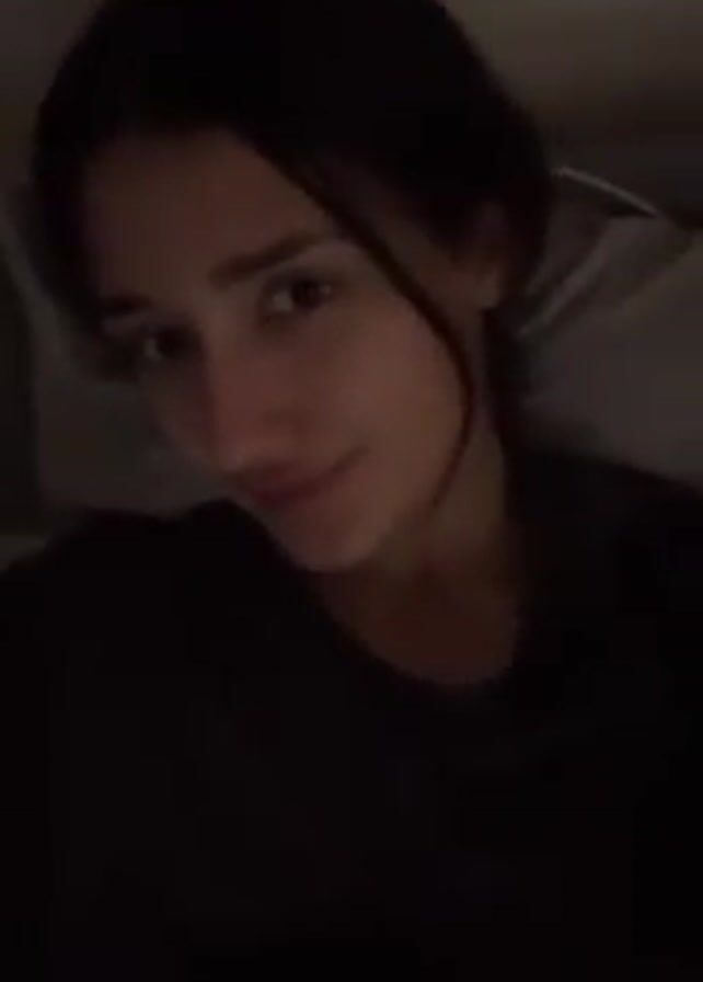 A person with fair skin, brown eyes, and dark brown hair with lighter streaks framing the face is visible from the chest up. The person is wearing a dark-colored, possibly black, t-shirt. They are lying down, possibly in bed, against a light-colored pillow. The lighting is dim, and the video quality is slightly grainy. The person is looking directly at the camera with a small, slight smile.