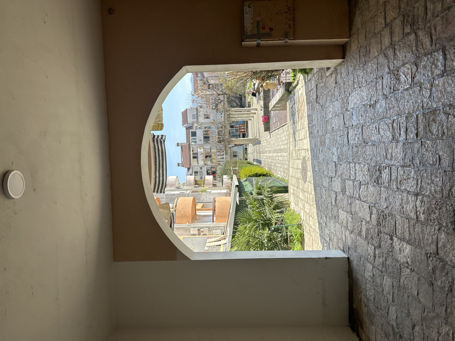 The image depicts an outdoor residential scene in Budva, Montenegro, viewed through a stone-paved arched passageway