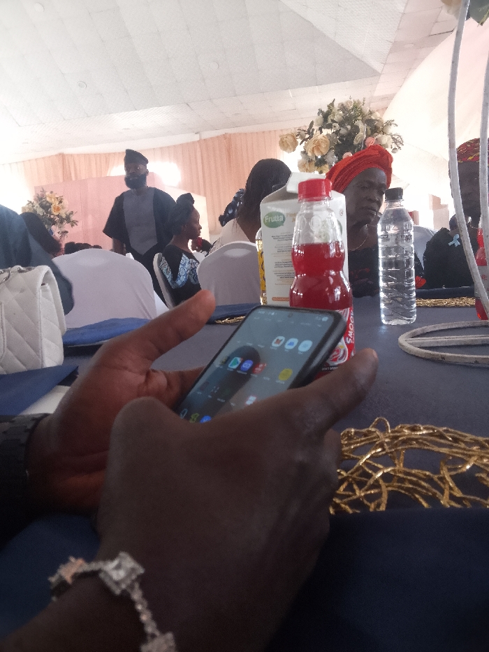 This image depicts an indoor social gathering occurring within a decorated event space in Unknown, Unknown. In the immediate foreground, a person's dark-skinned hands hold a black smartphone, oriented vertically, displaying various app icons on its screen. The left wrist wears a silver-toned bracelet featuring square-cut white gemstones. The hands rest on a dark blue tablecloth, where a crumpled gold-colored metal decorative item is also visible to the right. On the table in the midground, from left to right, a white quilted handbag with a silver chain strap is present. Alongside it are various beverages: a clear plastic bottle with a red cap containing a red liquid (with "SMOOTH" partially visible on its label), a white cardboard carton labeled "Frutta", and a clear plastic bottle of water with a black cap. Further back, seated individuals include a woman wearing a red headwrap, looking towards the right, and another person partially obscured by the "Frutta" carton. In the background, a bearded man, dressed in a dark tunic over a lighter grey garment and a dark cap, stands in the left-center, facing left. To his right, a woman in a dark headwrap and a patterned top is seated. White, high-backed event chairs and floral centerpieces with white and cream-colored roses are visible on other tables. The environment features a white, paneled tent-like ceiling and light-colored drapes, likely peach or pink, lining the walls, suggesting a temporary event structure or decorated hall. The scene is brightly lit.