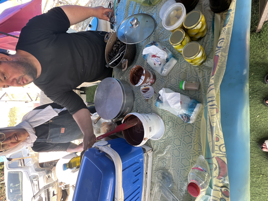The scene takes place at a food stall in Bat Shlomo, Israel. A man in a black shirt is stirring a bowl of chocolate spread with a red spatula. Behind him, a woman wearing a white scarf and a blue apron is watching. The stall has a blue and white patterned tablecloth on which are several items, including: a blue cooler, a round metal container, a metal bowl with black olives, a glass container with a lid, four glass jars with olives in them, a clear glass bottle with water, a small jar with spices, and two packages of paper napkins. The scene is set outdoors on a grass lawn.