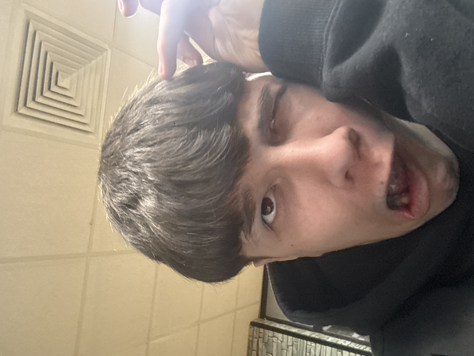 A single individual, identified as being in Botevgrad, Bulgaria, is depicted in a headshot-style image. The individual, appearing male, has medium-dark brown hair styled in a bowl cut and wears a black hooded sweatshirt. The right eye is open and directed forward, while the left eye is squinted or winking. The mouth is open, with the lower lip pulled downward and to the left, exposing the inner lower lip and some teeth; the exposed tissue appears reddish. The individual's left hand is partially visible above the head, with fingers extended near the hair. The background features a light-colored ceiling with grid-patterned tiles and a square, multi-layered HVAC vent in the upper right quadrant. A portion of a wall or structure with a grey and beige textured surface, resembling stacked stone or brick, is visible in the upper left background. The scene is indoors and well-lit.