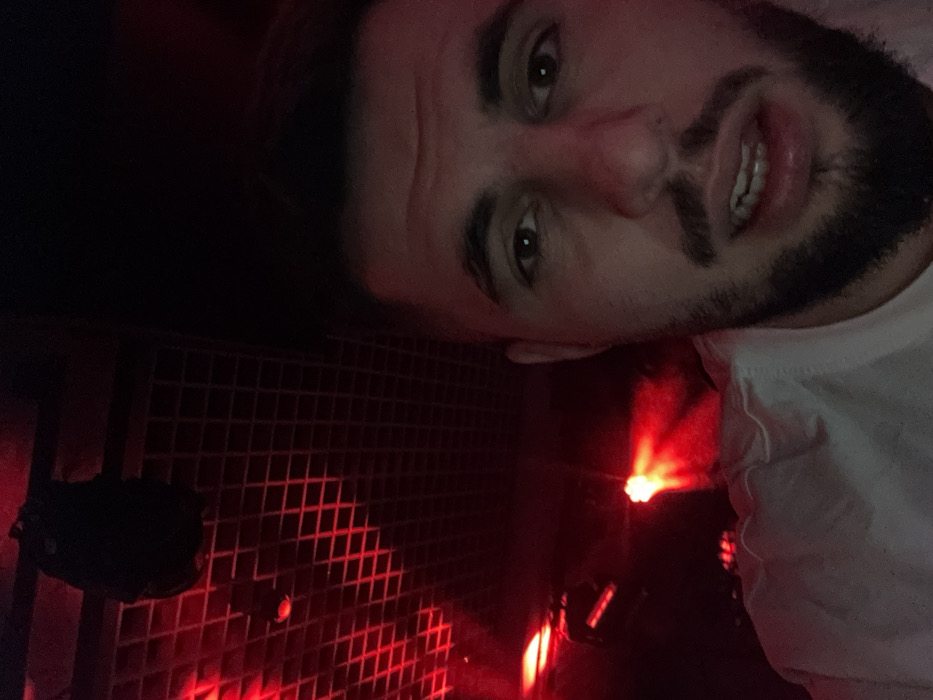 The image displays a close-up, low-light selfie of a male individual in an indoor venue, likely a nightclub or bar, under predominant red artificial lighting