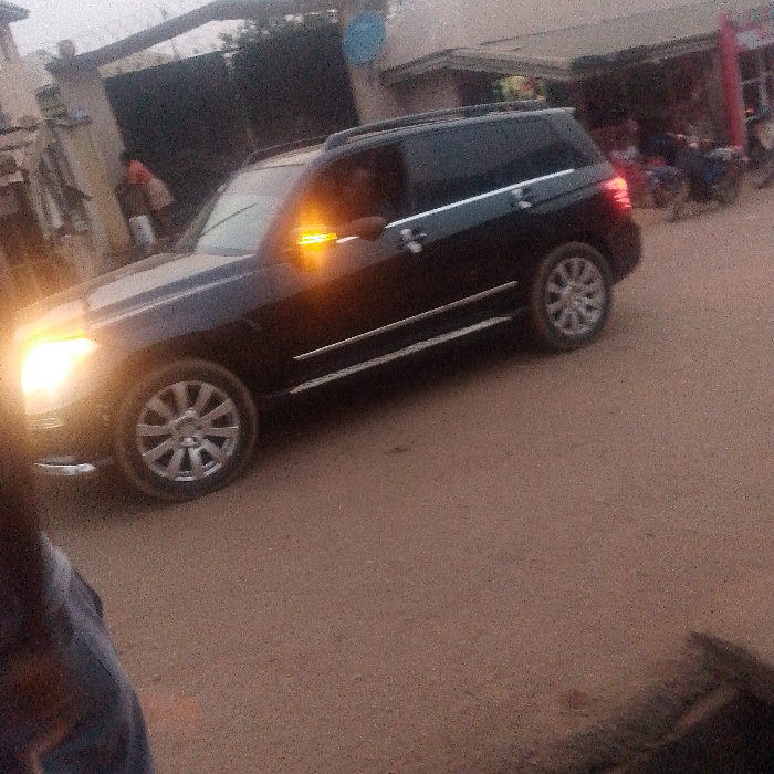 A black Mercedes-Benz GLK SUV is parked on a street with a sandy, uneven surface. The vehicle is positioned at an angle, revealing its front and side. The headlights and turn signals are illuminated. The wheels have a multi-spoke design. In the background are buildings, a structure with a blue sign, and a few people, including individuals on motorcycles. The overall image quality appears somewhat grainy, likely due to the lighting conditions.