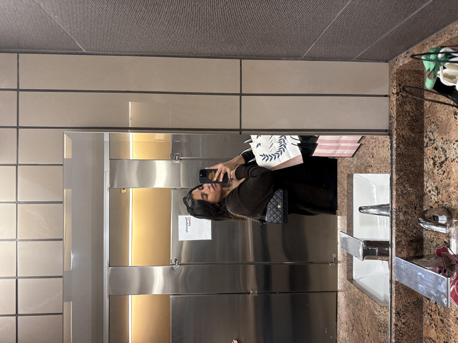 An image taken in a public restroom in Lawrence Township, United States, depicts a young adult female captured in a mirror selfie
