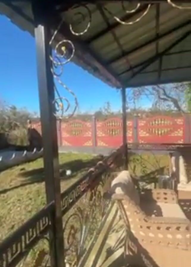 gazebo with a metal frame and roof. Inside the gazebo is furniture, including a table and chairs with cushions. Outside the gazebo is a green lawn and a red and gold fence. The sky is blue and clear. The camera pans slightly upward.