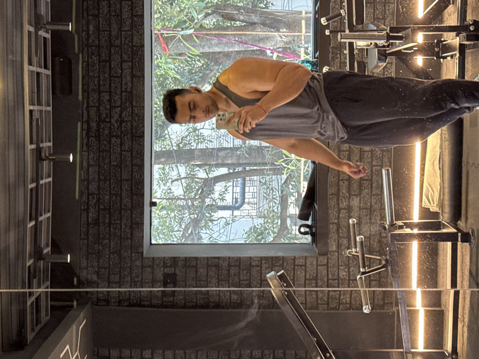 A muscular man wearing a gray tank top and dark pants is taking a selfie in a gym