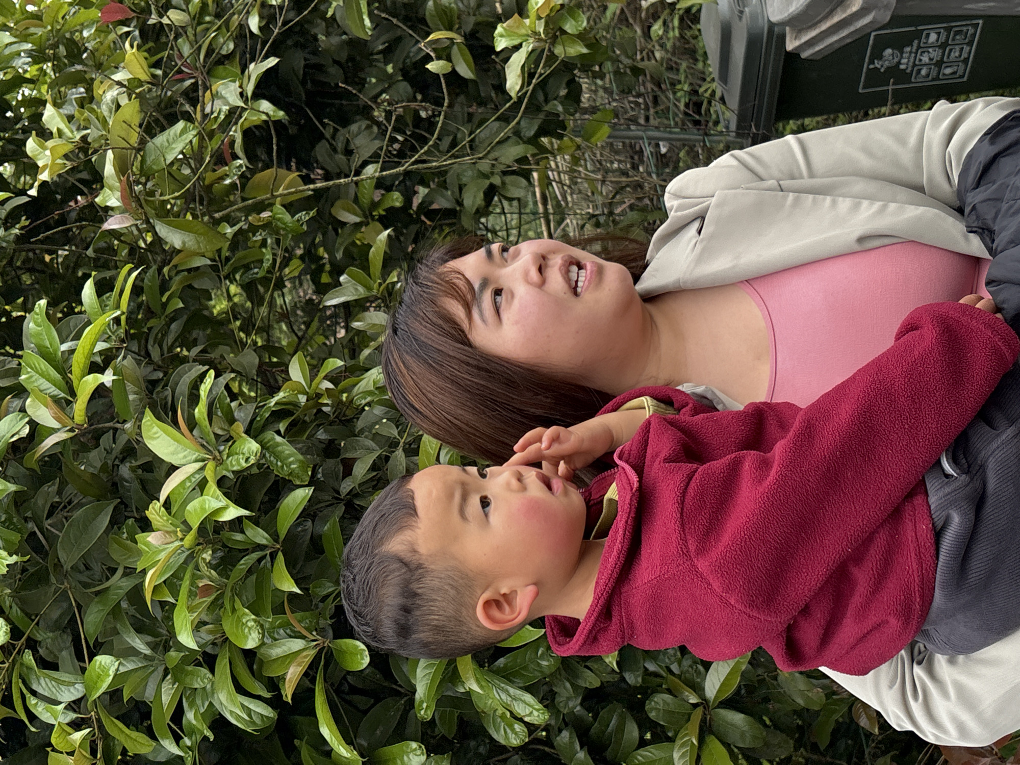 A woman holds a young child. They are outdoors, standing against a backdrop of dense green foliage. The woman has brown hair and is wearing a pink top and a light grey jacket. The child is wearing a dark red hooded fleece jacket. The image was taken in Xianfeng, China.