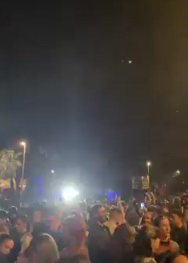 At night, a crowd of people is gathered at what appears to be an outdoor concert or event. The crowd is dense, with many faces visible. Stage lighting is visible in the background, and fog or smoke effects are in use. Laser beams and colored lights illuminate the sky above the crowd, creating a dynamic atmosphere. Streetlights and nearby trees are also visible. The scene suggests an energetic and festive mood.