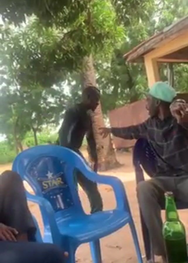 Three men are in an outdoor setting on a sandy surface. One is sitting in a blue plastic chair, wearing a green hat, a plaid shirt, and gray pants. A green beer bottle sits on the ground next to his chair. Another man in a black long-sleeved shirt stands facing the seated man, gesturing animatedly with his hands. The third man is only partially visible, sitting in another blue chair. A tree is visible in the background, and a building with a porch roof can be seen to the right. Music plays in the background.