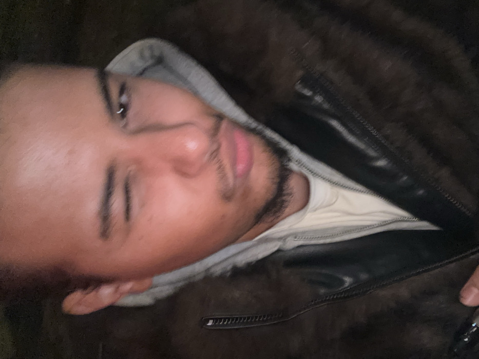 A male individual with medium-dark skin tone, short dark hair, and a short beard is depicted from the chest up, facing forward. He is winking with his left eye (viewer's right) and puckering his lips. A silver ring piercing is visible in his right eyebrow (viewer's left). He is wearing a light-colored t-shirt or undershirt, a grey hooded sweatshirt, and an open dark brown jacket with a textured, possibly faux fur, appearance and black leather-like trim featuring a zipper down the left side. The background is dark and out of focus, providing no discernible features. The specific location in Maisons-Alfort, France, cannot be determined from the visual information presented in the image.
