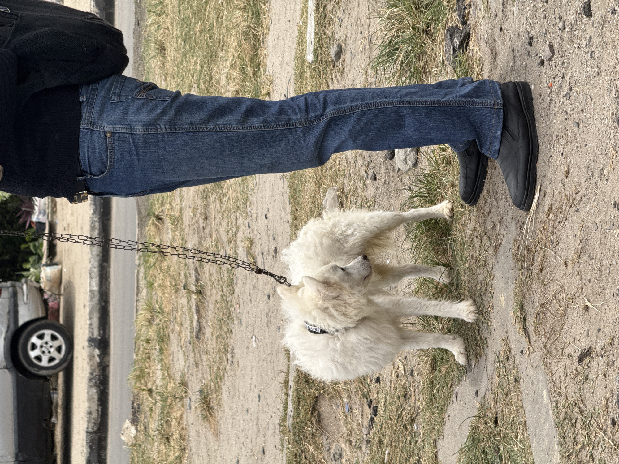 In Ilado, Nigeria, an outdoor scene depicts an individual standing next to a white, fluffy dog. The person is observed from the mid-torso down, wearing blue denim jeans, a black long-sleeved top or sweater, and black slip-on shoes. A black backpack is visible on their back. The individual holds a black metal chain leash, which is attached to a black collar on the dog. The dog is a medium-sized canine with dense, white, curly fur and is standing on all four paws, facing to its left. Its collar appears to have white lettering, possibly reading "NAPE". The ground is primarily dry soil with sparse patches of light green and brown grass. A narrow concrete path or curb separates the foreground from a paved road in the background. On the road, a silver sedan with a dark bumper is partially visible. A white sack is situated near the vehicle. The overall environment appears dry and dusty under ambient daylight.