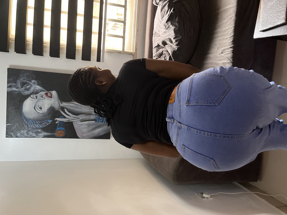 This image captures an indoor scene within a private residence in Abuja, Nigeria. The central subject is an individual, presumably female, viewed from behind and positioned with a slight forward lean. She is dressed in a black short-sleeved top and light blue denim jeans, which feature a small brown tag with yellow text above the right rear pocket. Her hair is styled in dark braids, and a single gold-colored stud earring is visible on her right earlobe. Behind the individual, a large vertical painting is mounted on a light-colored wall. The artwork depicts a stylized female figure, rendered primarily in grayscale with blue accents on her hair and a bracelet, and red lips. The figure is shown holding a cigar, from which white smoke emanates upwards. Adjacent to the painting on the right, a window fitted with horizontal black Venetian blinds allows natural light into the room. A dark brown sofa, partially covered by a crumpled dark fabric object, is visible in the background to the right. A section of a dark-colored table with indistinct items rests in the lower right corner of the frame. On the lower left wall, a white electrical outlet with a white cord plugged in is visible.