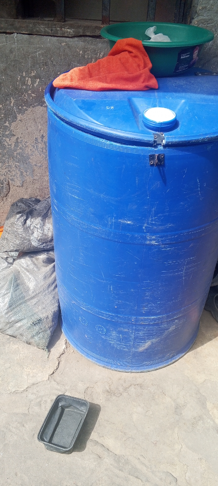 The scene depicts an outdoor utility area in Doma, Nigeria, under bright daylight. A prominent, scratched blue plastic barrel, approximately 200-liter capacity, stands upright in the center-right. An orange fabric item rests on the barrel's domed top, near a white-capped blue screw fitting. A metal hinge with two screws is visible on the barrel's side, securing what appears to be a hinged lid. To the immediate left of the barrel, two grayish-black woven sacks, appearing full, are stacked on a dirt ground and lean against an irregularly textured wall. Above and to the right of the barrel, a green plastic basin containing a translucent white object is positioned against the same background wall. In the lower left foreground, a dark gray rectangular plastic tray rests on a cracked, light-colored concrete surface. No individuals or active interactions are present.