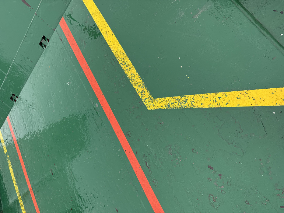 - "A wet, dark green painted deck or platform is depicted, featuring worn safety markings" by FM-f3YST2, licensed under CC BY 4.0