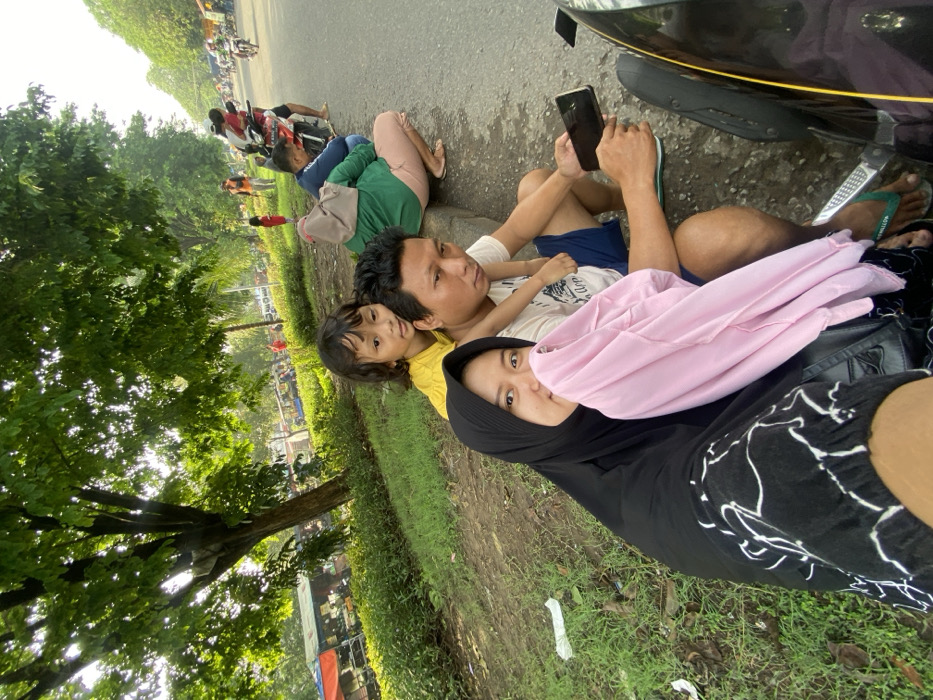 A group of people, including a woman wearing a black hijab and a pink head covering, are lying on the ground next to a road and a grassy area with trees. A man is holding a smartphone, and a young child wearing a yellow shirt is next to him. Other people are lying further down the road near parked motorcycles. The group appears to be relaxing outdoors in a public space.