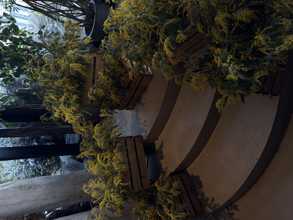 This image displays a decorative indoor stairwell, likely within a commercial establishment in Saint Petersburg, Russia. The scene features a set of three curved concrete steps, dark gray in tone, forming an arc from the lower right to the upper left. These steps are extensively decorated with numerous rectangular wooden crates, approximately 30-40 cm in length, positioned on and around the stairs. Each crate is overflowing with dense arrangements of branches from a yellow-flowering plant, consistent with mimosa (Acacia dealbata), characterized by small, spherical yellow blossoms and green foliage. In the background, large windows reveal a blurred, frosted, or snow-covered outdoor environment, indicating a cold climate typical of winter in Saint Petersburg. Visible through the windows are outlines of trees. To the left, a substantial, light-colored wooden column or structural element stands vertically. In the upper right background, a tall, bare-branched plant is housed in a dark, cylindrical planter. The overall lighting is dim and ambient, and no individuals are present in the static scene.