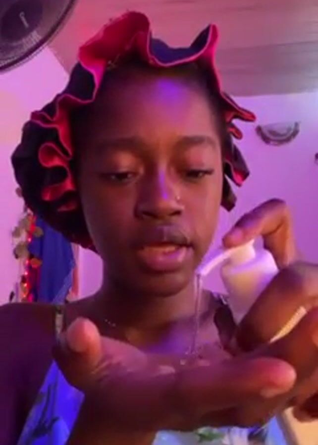 A young woman with dark skin, wearing a blue floral tank top and a black hair bonnet with red trim, dispenses a clear liquid from a white pump bottle into her left hand