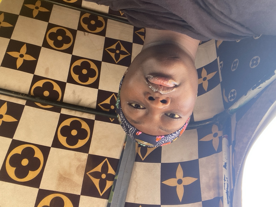 A person with dark skin and a printed headband poses from an upside-down perspective. The individual is in a vehicle with a checkered pattern featuring flower-like designs. The background pattern is light brown and dark brown, giving a unique backdrop to the photo. The person is wearing a dark shirt or top. The vehicle frame is visible, adding structure to the composition.