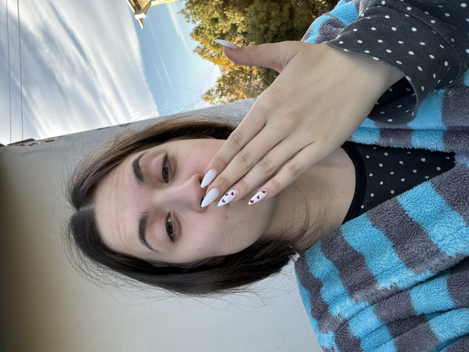 A young female subject is depicted outdoors in the city of Tbilisi, Georgia, with her right hand raised to her face. She possesses dark brown hair, light brown eyes, and fair skin, looking directly towards the viewer. Her right hand, featuring long, white, pointed fingernails with red heart decals on the ring, middle, and index fingers, partially covers her nose and mouth. She wears a light blue and dark grey horizontally striped fleece robe, with a dark, white-polka-dotted garment visible underneath. The background on the left consists of a plain, light-colored building wall. On the right, a clear blue sky with cirrus clouds is visible above a cluster of green and yellow-orange deciduous trees, with a light-colored building structure partially discernible beyond the foliage.