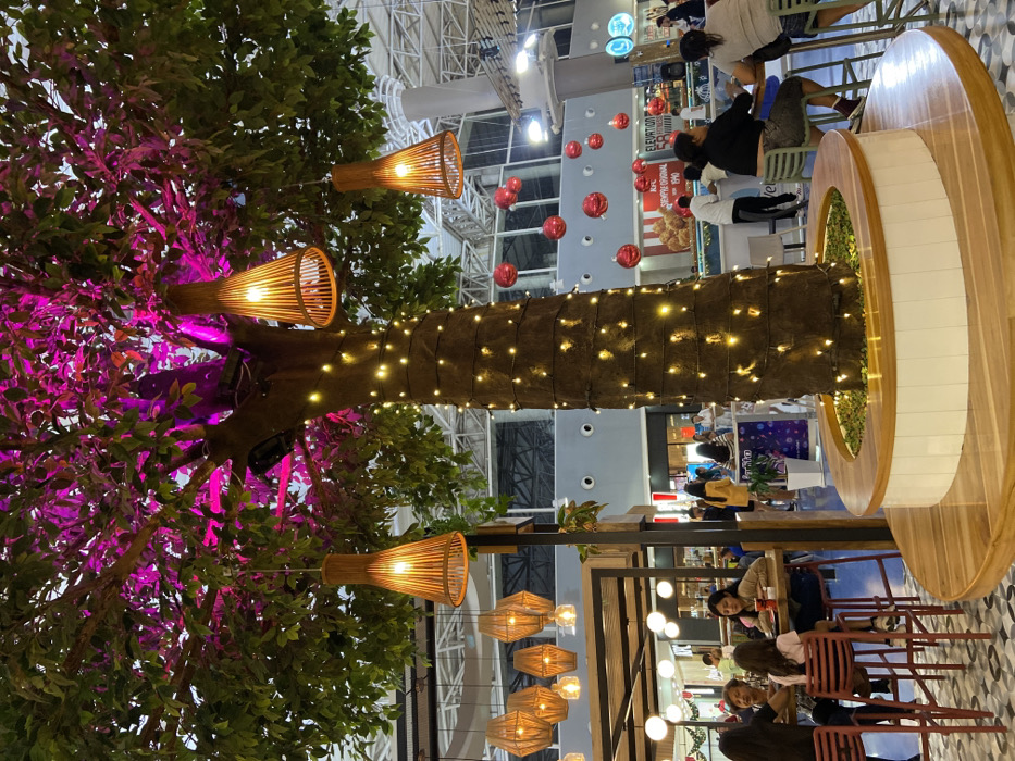 An indoor scene features a large, faux tree adorned with small lights wrapping around its trunk. The tree's branches hold several lantern-style lamps. Some of the foliage is illuminated with pink light. Seating areas are located below, with people sitting at tables. The surrounding area is a shopping mall with various stores and decorations like hanging red ornaments. The ceiling is high and industrial-looking.