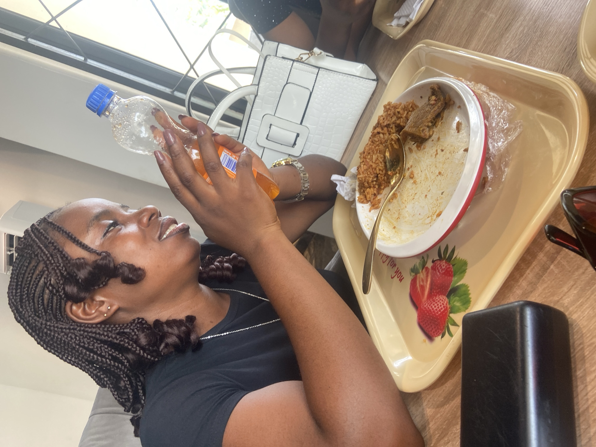 A female subject with dark skin and braided hair, styled with face-framing curls, is seated at a light brown wooden table in an indoor establishment in Nsukka, Nigeria. She wears a black t-shirt, a silver chain, and a gold-toned watch on her left wrist. Her attention is directed towards a clear plastic bottle with a blue cap, containing an orange liquid, which she holds in both hands. Her mouth is slightly open, suggesting speech or a smile. On a light beige plastic serving tray, positioned directly in front of her, rests a white plate with a red rim, containing partially consumed Jollof rice and a piece of meat. A gold-colored spoon is embedded in the food. The tray features a decorative strawberry decal on its left side. To the subject's right, a white, structured handbag with a crocodile texture and a large white buckle sits on the table. A black rectangular object, possibly a sunglasses case, is visible on the table to her left. A second individual's arm and shoulder, clothed in dark fabric, are partially visible on the far right. The background consists of a plain light-colored wall and a window with dark grilles, through which natural light enters the space.