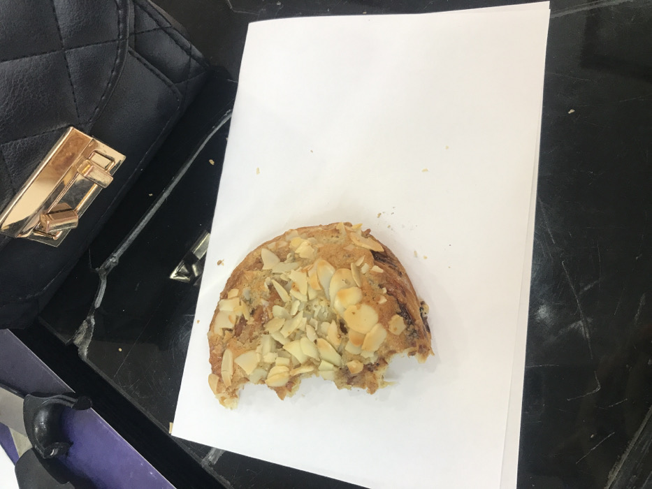 - "The image displays a partially consumed crescent-shaped pastry, heavily topped with slivered almonds, resting on a white sheet of paper" by FM-E3A3g1, licensed under CC BY 4.0