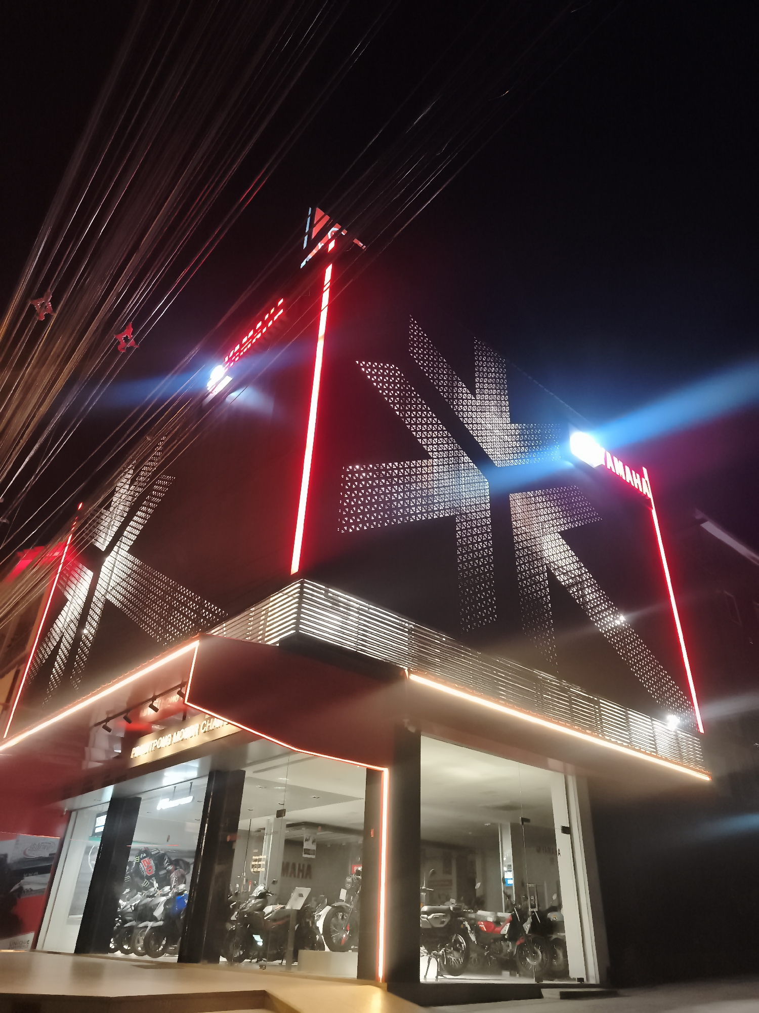 The image captures a Yamaha dealership at night in Baan Bo Phut, Thailand. The building's facade features the Yamaha logo in a patterned design, illuminated with red neon lights that form sharp lines around the logo. The store's front is primarily glass, providing a view into the showroom where several motorcycles are on display. An orange light runs along the edge of the roof. The sky is dark, suggesting nighttime. Cables are visible running across the upper left portion of the image.