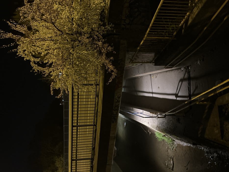 This image depicts a nighttime scene under an urban road bridge over a narrow watercourse in the City of Zagreb, Croatia. An elevated concrete bridge structure crosses the upper-middle of the frame, supporting a dimly lit roadway bordered by dark metal guardrails. To the upper right, a deciduous tree, heavily laden with pale yellow-white blossoms, is intensely illuminated, making it the brightest subject in the image. The sky above is dark and featureless. Beneath the bridge, a dark, narrow watercourse flows from left to right, bordered on the near side by a concrete embankment and on the far side by a muddy bank with sparse green vegetation. A concrete pedestrian path runs along the watercourse on the left, partially illuminated by an unseen light source and featuring a blue metal handrail. On the right, a wider concrete pedestrian ramp or pathway slopes downward, bordered by a yellow metal handrail. This path is also partially lit, showing scattered debris and casting long shadows from the railings. The concrete underside of the bridge displays graffiti, particularly visible on the right side. No individuals or active interactions are present.