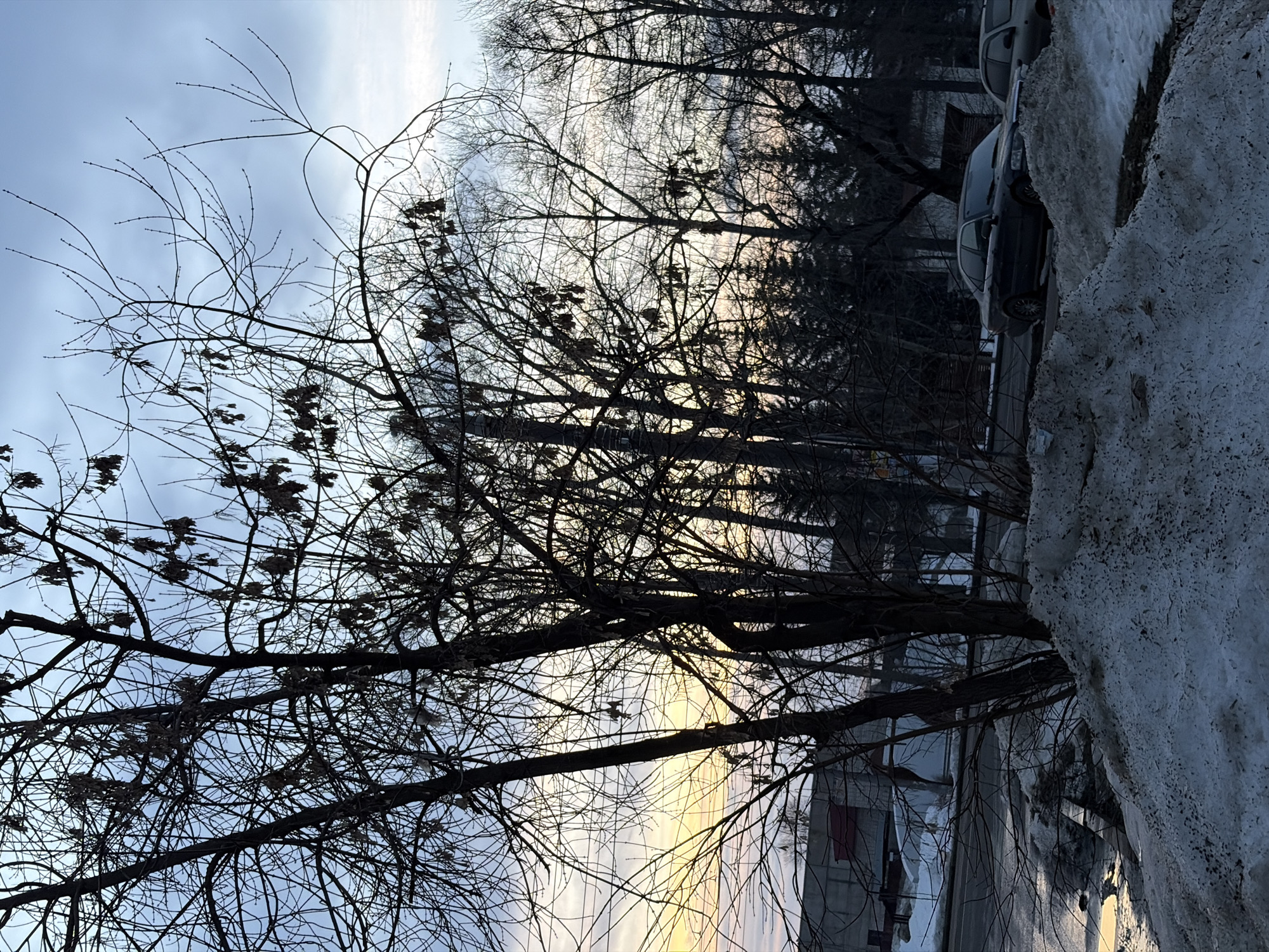 The image depicts an outdoor, urban scene in Izhevsk, Russia, at twilight, consistent with either sunrise or sunset during late winter or early spring. The sky transitions from light blue-grey with faint clouds overhead to a distinct band of yellow, orange, and pale pink hues near the horizon on the left. The foreground and midground are dominated by numerous bare deciduous trees, their intricate, dark branches silhouetted against the sky. Some branches retain clusters of dried, brown leaves or seeds. A denser line of dark evergreen trees is visible further back on the right side. The ground in the foreground and along the roadside is covered in irregular piles of melting snow, heavily mixed with dirt and debris, appearing slushy in places. A dark, wet asphalt road with reflective puddles traverses the mid-lower section of the image. Two parked sedans, one dark-colored and one lighter, are partially visible on the right side of the road, obscured by snow piles and trees. In the distant background on the left, a light-colored, utilitarian building with a red roof section is partially visible. A dark utility pole with equipment is present on the left side behind the foreground trees. No individuals or specific actions are visible.