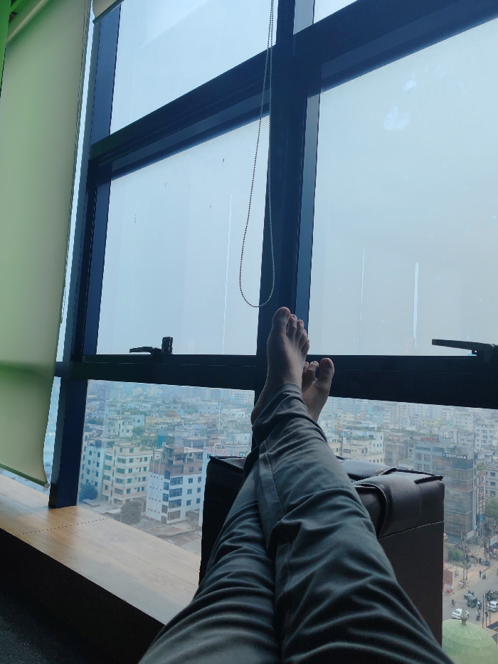 The scene depicts an elevated view from inside a building, looking outward through a large window towards an urban landscape in Dhaka, Bangladesh. In the immediate foreground, the bare feet and lower legs of an individual, clad in grey trousers, are visible, positioned horizontally and resting on a dark, cushioned object. The window assembly features dark-framed glass panels, with a vertical metallic beaded chain suspended from the upper frame and a dark latch mechanism on a lower horizontal frame. A light green vertical element is present on the left side of the window, and a wooden sill extends along its base. Beyond the window, a dense city environment is visible, characterized by numerous multi-story buildings of varying heights and architectures. Ground-level street activity, including vehicles and pedestrians, is discernible. A building in the mid-ground displays a visible sign reading "DENTORIA," confirming the location as Dhaka. A green dome structure is also observed in the lower right portion of the outdoor view. The sky appears uniformly light, indicating an overcast or hazy atmospheric condition.