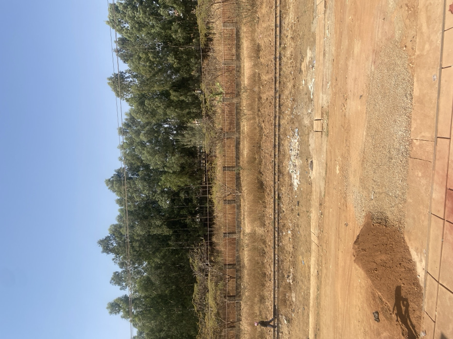 A wide-angle, elevated daylight view captures a dry, semi-urban landscape in Gura Top, Nigeria. In the immediate foreground, a reddish-brown tiled or paved surface transitions into a wide expanse of reddish-brown dirt. On this dirt, a conical pile of reddish soil is visible on the left, alongside a flatter spread of light-colored gravel on the right. Farther back, a pair of parallel railroad tracks runs horizontally across the mid-ground. A lone individual, dressed in a dark top and light-colored head covering, walks left-to-right on the far side of the tracks. To the right of the individual, a small collection of white and light-colored debris is present near the tracks. Behind the tracks, a low, dark-colored metal fence with concrete posts spans a strip of dry, light-brown vegetation, punctuated by several sparse trees. The background is dominated by a dense line of tall green trees beneath a clear, bright blue sky. Multiple thin power lines are visible horizontally across the upper mid-ground, in front of the treeline.