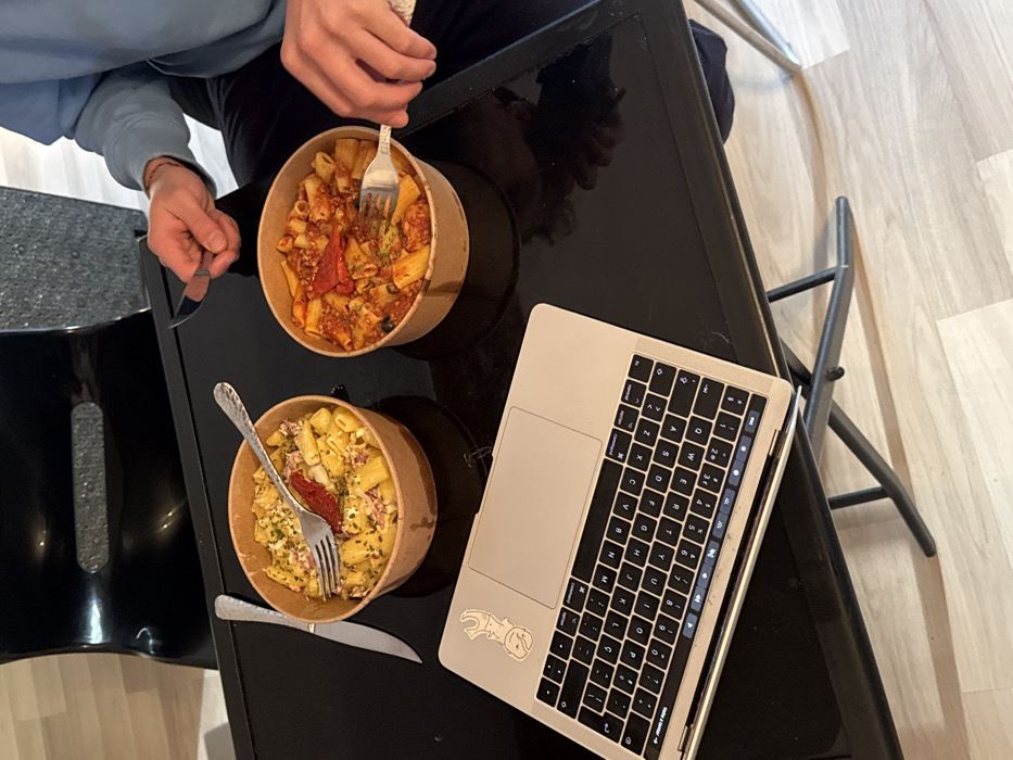 - "An indoor, overhead shot depicts a black, reflective foldable table set with two pasta bowls and a laptop" by FM-6wyrF3, licensed under CC BY 4.0