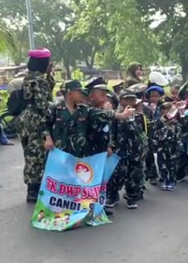 group of young children dressed in military camouflage uniforms standing on what appears to be a paved road or sidewalk. They are carrying a light blue banner with the text "TK DWP SURYA CANDI-Q". An adult dressed in a similar camouflage uniform with a pink beret stands next to them. There are other adults, some wearing hijabs, accompanying the children. The environment includes trees and greenery in the background, suggesting they are outdoors, possibly in a park or a public space. The children appear to be waiting or posing for something, possibly a parade or event.