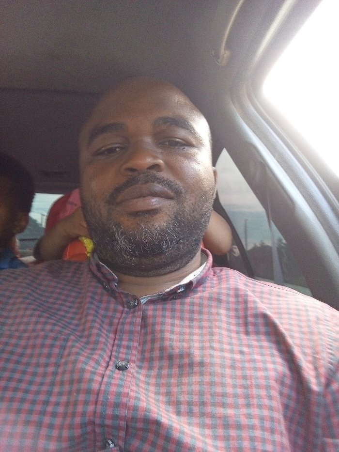 An adult male with a dark complexion, bald head, and a full greying beard is shown in a close-up, chest-up shot, positioned inside a vehicle