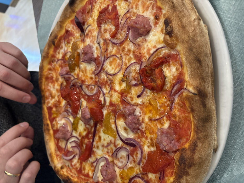 A close-up, high-angle shot depicts a freshly baked pizza served on a white round plate, resting on a light blue textured tablecloth. The pizza features a golden-brown, well-risen crust with localized charring. Its surface is covered with a melted white cheese and tomato sauce base, topped with numerous slices of red onion, irregular chunks of cooked sausage, roasted red pepper pieces, and some scattered yellow pepper segments. In the upper background, the hands of an individual are visible, positioned above the pizza. The left hand displays a gold band on the ring finger. The individual is wearing a dark, possibly grey, long-sleeved garment. The scene takes place indoors, likely within a restaurant or pizzeria in Ferrara, Italy.