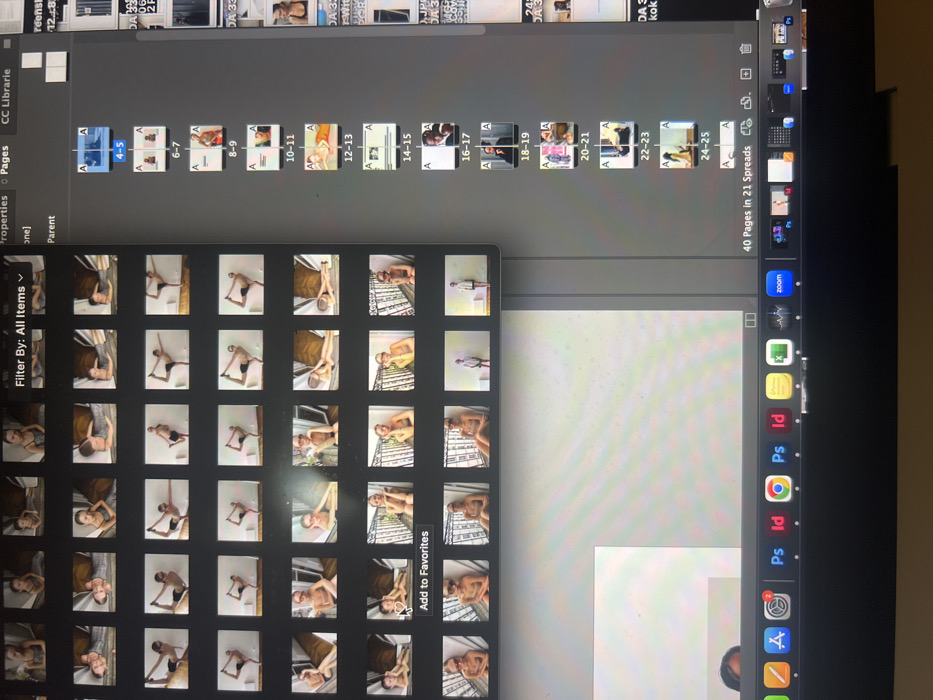 The screenshot shows a computer screen displaying an Adobe InDesign document. The Pages panel shows thumbnails of spreads, numbered 4-5 through 24-25. The CC Libraries panel is open, displaying a collection of images, primarily of a person in various poses. The taskbar at the bottom displays icons for applications including InDesign, Photoshop, Zoom, and others. Text labels on the application icons and panels are partially obscured. The image quality is affected by the angle and lighting of the photograph.