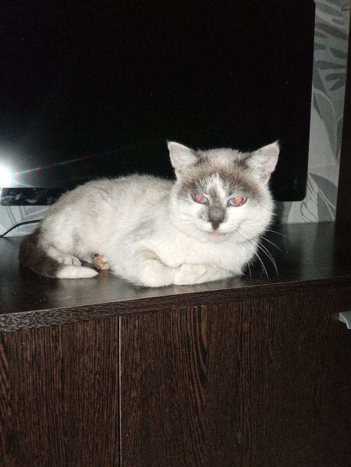 A cream and grey-brown bicolor cat is depicted resting on a dark brown, wood-grained surface, identified as a cabinet top, in Красный Маяк, Russia. The cat is positioned centrally, directly facing the camera with its front paws tucked beneath its body. Its left eye is blue-grey, while the right eye exhibits a pronounced red-eye effect. A small pink tongue is visible protruding slightly from its mouth. Behind the cat, a large, dark, rectangular screen, likely a television, occupies the upper background. To the right of the screen, a wall is visible with a light grey, leaf-patterned wallpaper. The cabinet below the cat's resting place matches the dark wood grain, featuring vertical panel lines and a partially visible silver handle on the far right.