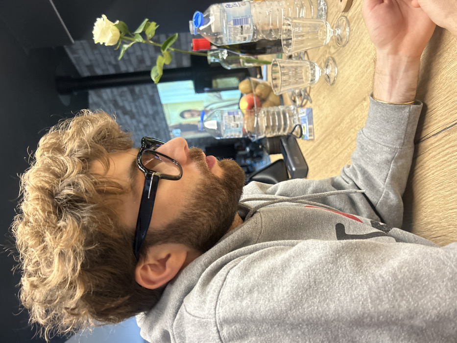 An indoor scene in Saint-Médard-en-Forez, France, depicts a male individual in profile, seated at a light-colored wooden table