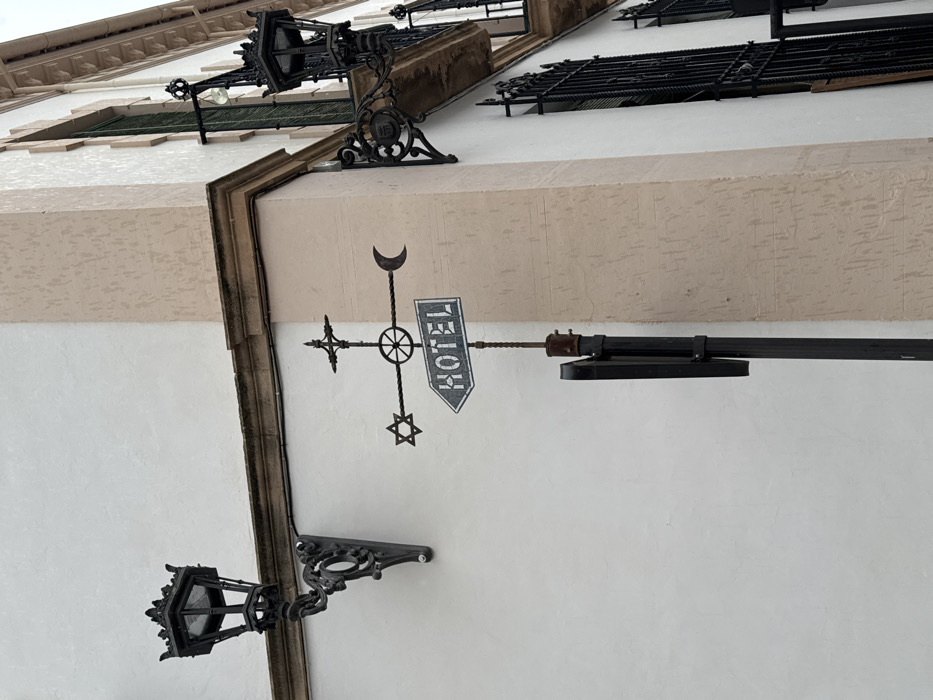 - "An ornate metal hotel sign is affixed to a pole at the exterior corner of a multi-story building in Ronda, Spain" by FM-n7ZCd2, licensed under CC BY 4.0