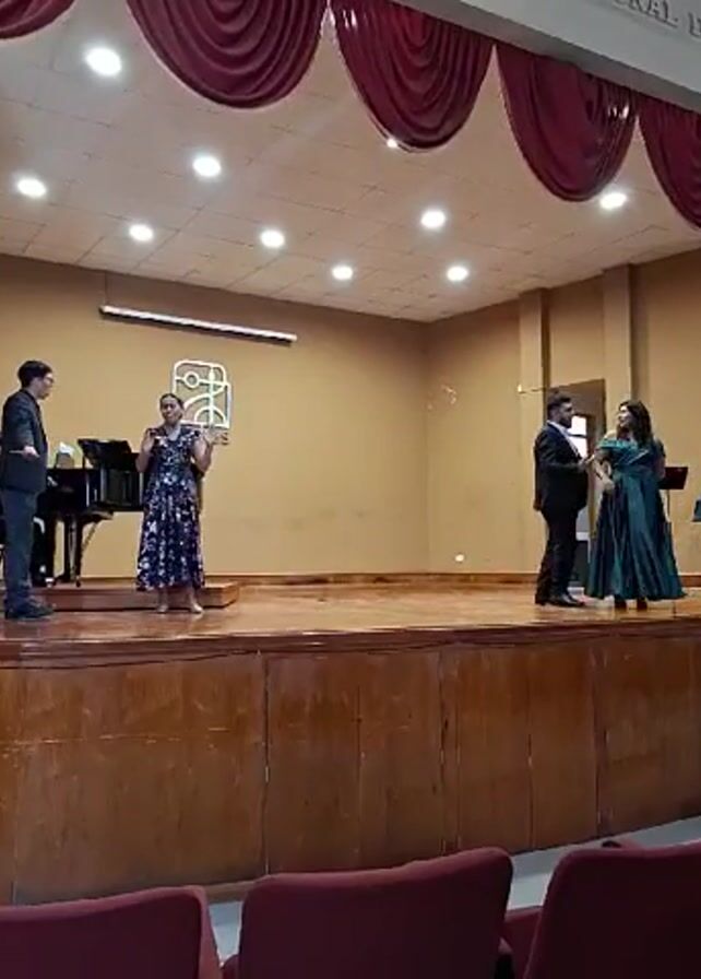 A group of people is performing on a stage. A man sits and plays a piano to the left. Three people are standing and singing; a man in a suit and glasses, a woman in a blue floral dress, and a woman in a green dress accompanied by a man in a suit. The stage is wooden and has a logo on the back wall, as well as curtains hanging. The background of the video shows several rows of empty red chairs.