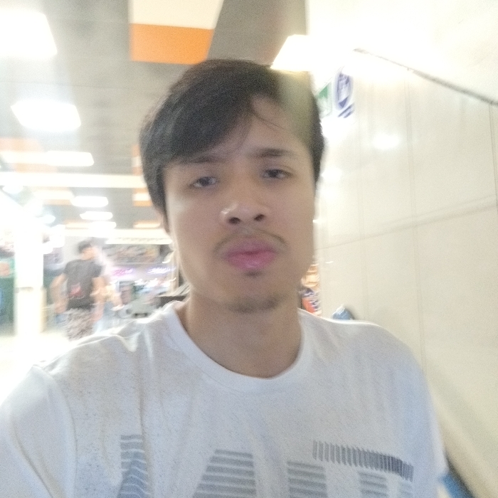 A selfie shows a young man with dark hair and a mustache, wearing a white t-shirt with gray lines